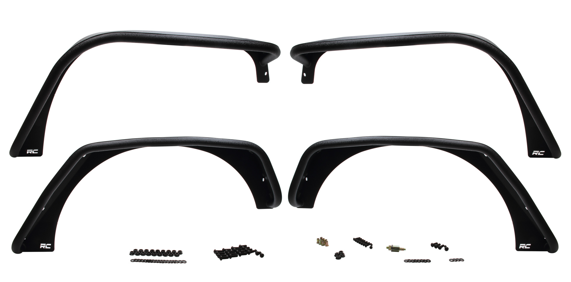 Product Description Fender Flare - Front / Rear - 8 in Wide Front, 5 in Wide Rear - Steel - Black Powder Coat - Jeep Wrangler JK 2007-18 - Kit
