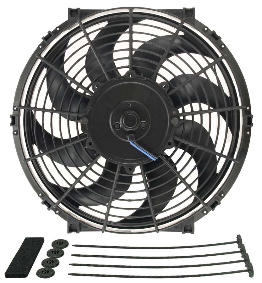 Product Description Electric Cooling Fan - Tornado - 12 in Fan - Push / Pull - 880 CFM - 12V - Curved Blade - 11.5 x 12.5 in - 2.5 in Thick - Install Kit - Plastic - Kit