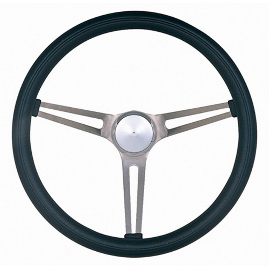Product Description Steering Wheel - Classic Nostalgia - 15 in Diameter - 4.125 in Dish - 3-Spoke - Black Foam Grip - Stainless - Brushed - Each