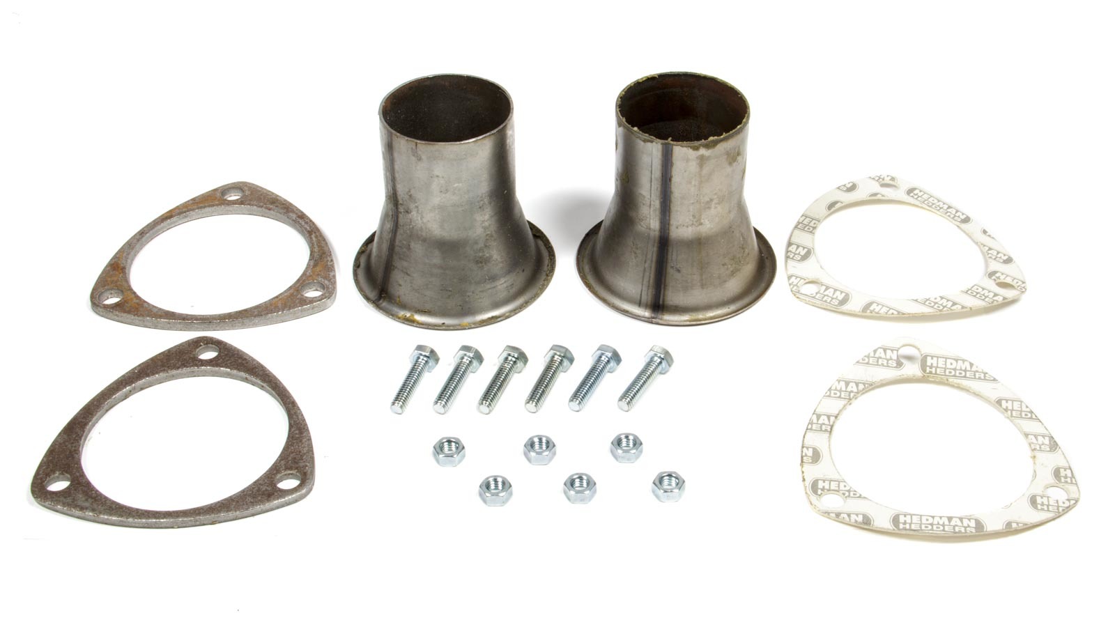 Product Description Collector Reducer - Husler Race - 3.5 in Inlet to 2.5 in OD Outlet - 3-Bolt Flange - Gaskets - Steel - Natural - Pair