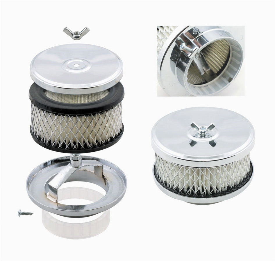Product Description Air Cleaner Assembly - Deep Dish - 4 in Round - 2.75 in Tall - 2-5/16 in or 2.625 in Carb Flange - Raised Base - Steel - Chrome - Kit