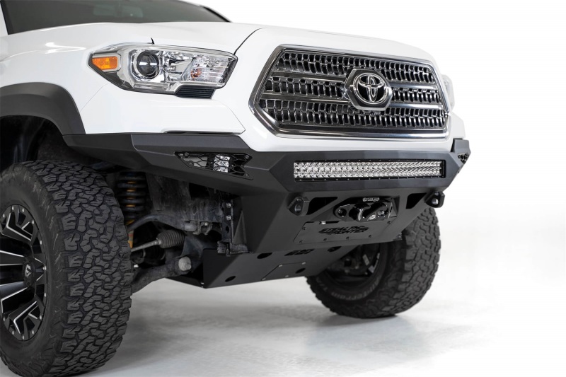 Addictive Desert Designs Stealth Fighter front bumper for the Toyota Tacoma is one of our best fitting and most aggressive looking bumpers on the market. A modern radius plate design allows the Stealth Fighter to keep a tight fit around the front of the Tacoma to match the factory design, while providing added protection. With our patented universal light mount system a 30 in. radius LED bar or up to 6 cube lights can be mounted into the center of the bumper. Additional lighting is available with two cube light mounts behind the side panels. Reinforced clevis mounts allow the use of a 3/4 in. D-Ring for added utility.