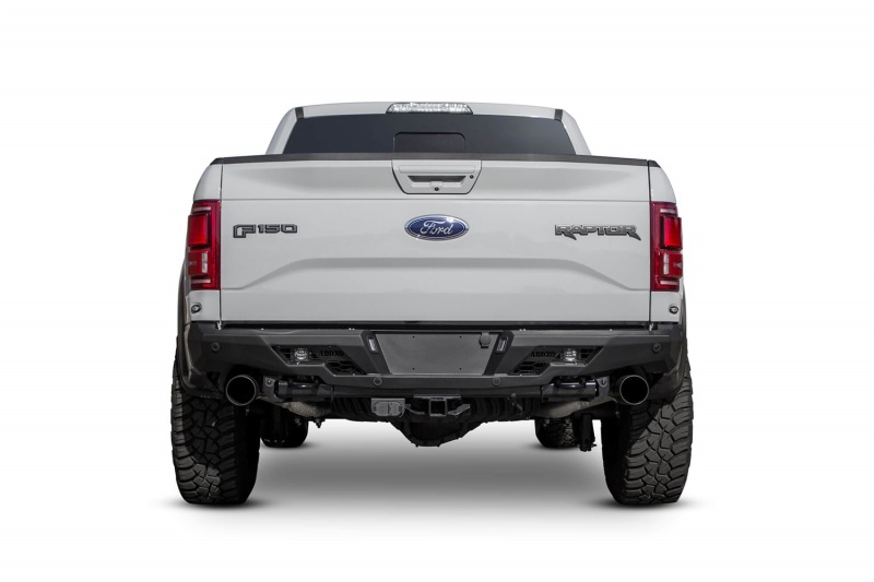 Addictive Desert Designs Stealth Fighter rear bumper is one of the slimmest bumpers you can buy for your Raptor. Measuring the same length from the tailgate as the factory bumper, the Stealth Fighter adds protection to your truck without adding bulk and size. A unique style with sharp angles and recessed paneling follows the factory dovetail look and allows use of factory features such as parking sensors, tow hooks, and hitch. The Stealth Fighter comes standard with two rear face cube light mounts to give your truck additional lighting.