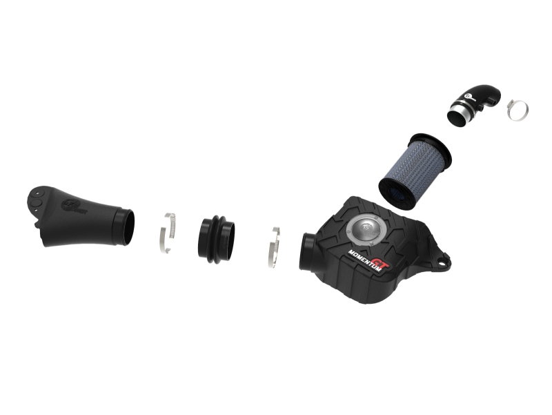 Momentum’s innovative filter-to-housing interface was built to feature the largest air filter possible. This 7” tall 360-degree radial flow air filter features a 2-1/2" flange and our pre-oiled Pro 5R media with five layers of progressively finer cotton gauze media for maximum performance. It provides your engine with the largest amount of high-flowing air and delivers the highest power gains in most cases. This media is perfect for street and/or track use. Its inverted top makes for more filter surface area, resulting in longer service intervals, while its expanded metal provides impact protection. The one-piece sealed housing, constructed of heat-resistant XLPE (cross-linked polyethylene) polymer, features our patent-pending filter-to-housing interface. Its innovative design minimizes the total number of parts, making for an easy installation. A clear sight window allows for hassle-free filter inspection, without having to disassemble your system. This system uses a high performance reinforced silicone intake tube to achieve maximum power gains while maintaining a perfect fit. The air inlet duct is constructed from XLPE that is heat soak resistant and extremely durable. It is CAD designed for perfect fitment and connects to the housing with a silicone bellow coupling to accommodate engine movement. High quality premium clamps and a silicone bellow coupling are used for durability while also providing the most secure installation available. Momentum GT intakes are designed with fewer parts for a quick and simple installation.