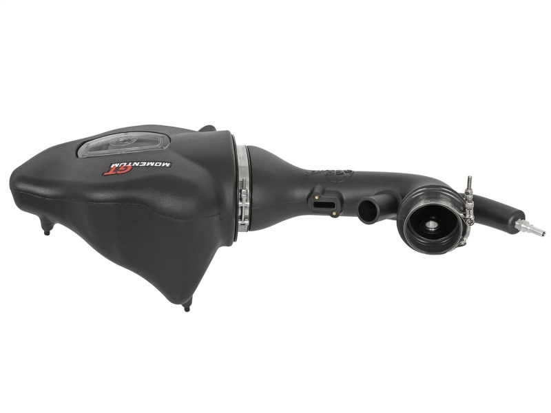 This Momentum GT intake system produces 15hp, 11lbs x ft of torque. The one-piece sealed housing includes auxiliary air inlet to eliminate the use of multiple-piece housings and ensure the coolest air intake charge available. A large, clear sight window is used for a hassle-free filter inspection and an aggressive style. A urethane plug is also included if you wish to block off the auxiliary air inlet. This system uses a high quality, dyno-tuned intake tube to achieve maximum power gains while maintaining a perfect fit. A custom high temperature reinforced silicone elbow coupling with aluminum fitting is included for easy install to the factory breather line.