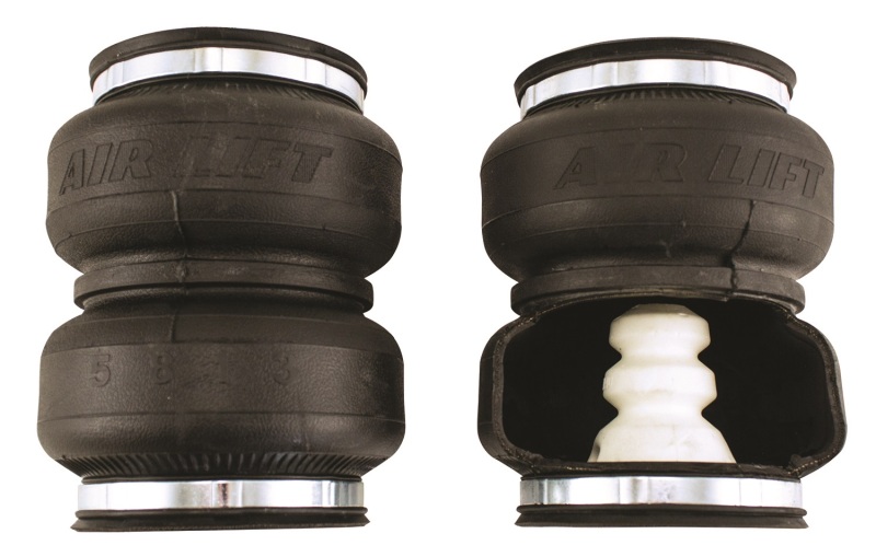 LoadLifter 5000 ULTIMATE Heavy Half-Ton adjustable air spring kits feature all of the benefits of our heaviest rated air spring with the addition of an internal jounce bumper inside the spring for the ultimate in ride comfort. An Air Lift exclusive product! Fits vehicles with in-bed hitches. Tow and haul the heaviest loads with safety and comfort with LoadLifter 5000 ULTIMATE Heavy Half-Ton adjustable air spring kits. Works with vehicle's leaf springs to provide your half-ton exceptional rear load leveling capacity and keeps the vehicle riding stable, level and comfortable whether loaded or unloaded. Fully adjustable from 5 to 100 PSI. The closed-cell urethane foam jounce bumper inside the ULTIMATE Heavy Half-Ton adjustable air springs provide a cushion of air that absorbs shock, eliminates harsh jarring on rough roads and protects vehicles carrying heavy loads. Never bottom out again with the ULTIMATE! LoadLifter 5000 ULTIMATE Heavy Half-Ton adjustable air springs are maintenance free! Safely run with zero air pressure because of the internal jounce bumper. Replaces factory jounce bumper that is sometimes removed when adding air springs.