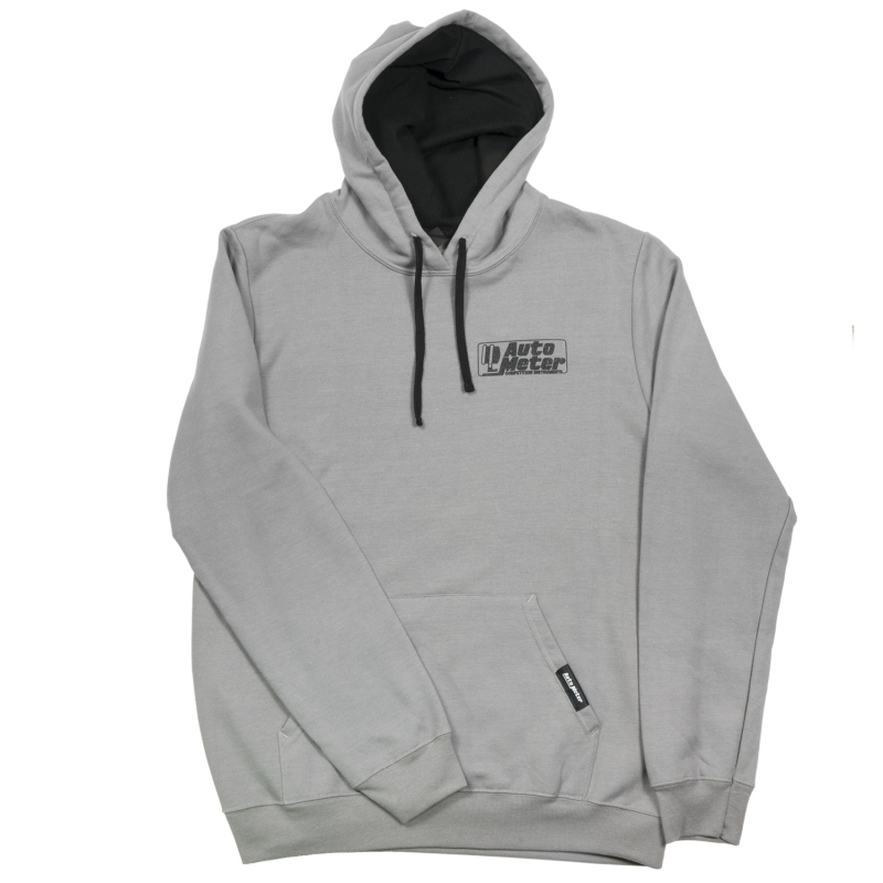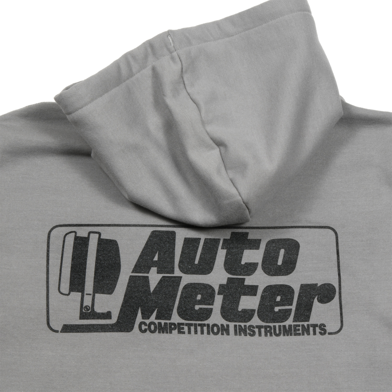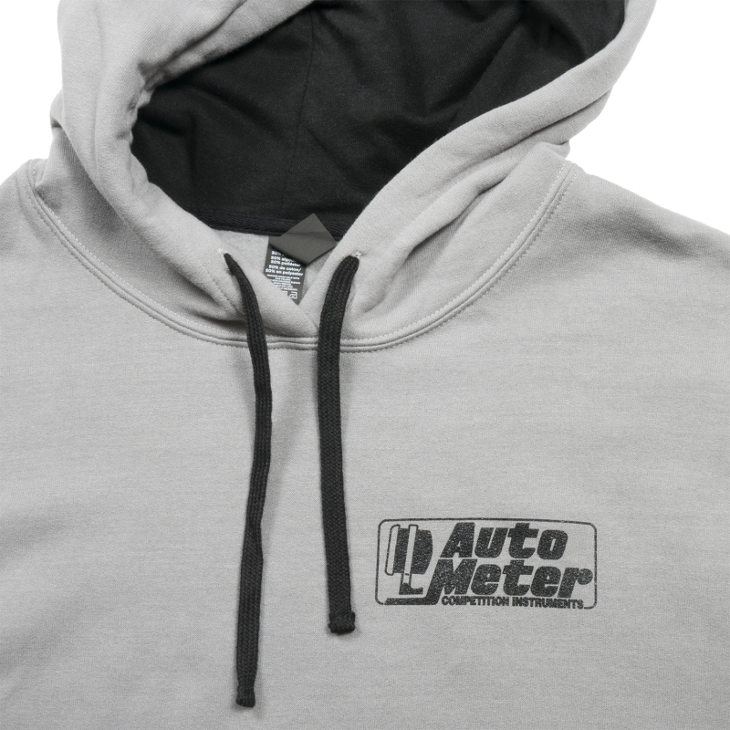 This gray fleece hoodie from AutoMeter will keep you toasty on those chilly mornings and evenings at the track. Features include a sewn fabric tag detail on left pocket, a screened black competition logo graphic on left chest, and large competition logo graphic on the back with contrasting black hood lining and drawstrings.