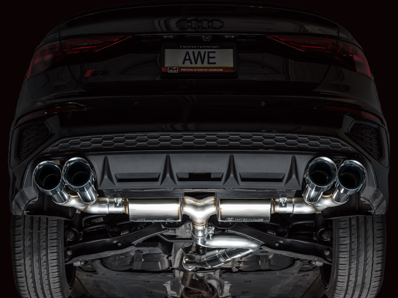 Introducing the first AWE Exhaust for the Audi S3 to ever feature patented drone-canceling 180 Technology®. The Touring Edition features a 3” inlet complete with an adapter to accommodate the factory downpipe perfectly while leaving an open 3” connection. In the rear resides AWE’s patented 180 Technology® resonators responsible for maintaining straight-through performance while decimating drone-prone frequencies. Thanks to the design and construction of 180 Technology® resonators, the internals will not break down and degrade over time causing tone change. Just full-bodied, drone-free rumble for life from the point of installation. This configuration provides the best ratio of interior refinement and exterior rumble on the market. No valves needed. Switch driving modes and the exhaust will render the same result as a vavled exhaust. It's the do-it-all exhaust for every day drivers. Comes complete with quad 4.5" slash-cut, double-walled tips in chrome silver. The AWE Touring Edition for the 8Y S3 is made in the USA and backed by AWE’s Fitment Guarantee, 50 state emissions compliance, No Check Engine Light Guarantee, and the AWE Lifetime Warranty.
