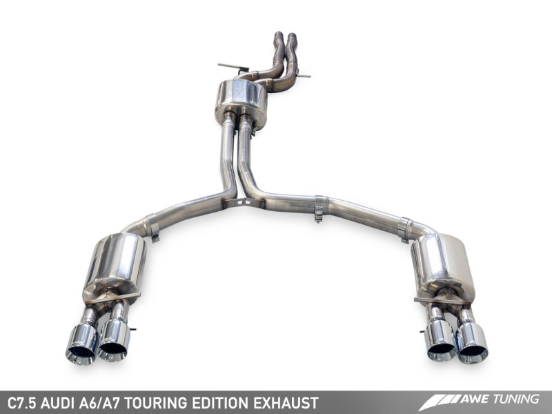 The AWE Audi A7 Touring Edition Exhaust features AWE's patented drone-canceling solution, 180 Technology® to combat drone at cruising speeds. Drop the hammer and the 3.0T will sing. The Touring Edition comes in a dual outlet configuration, featuring 102mm slash-cut tips on each side of the vehicle, designed to work with the factory rear valance. The tips are double walled to ensure a mirror finish even under hard usage. Each tip is individually adjustable, so stagger and depth into bumper can be set according to personal taste. The Resonated Downpipes (available separately) The AWE Resonated Downpipes feature resonators larger than the stock units in order to produce a mellow sound volume. Our Resonated Downpipes feature larger than stock tubing diameter. Bonus. Note: For those looking for the ultimate drone-free experience, we recommend pairing the Resonated Downpipes to the Touring Edition Exhaust.