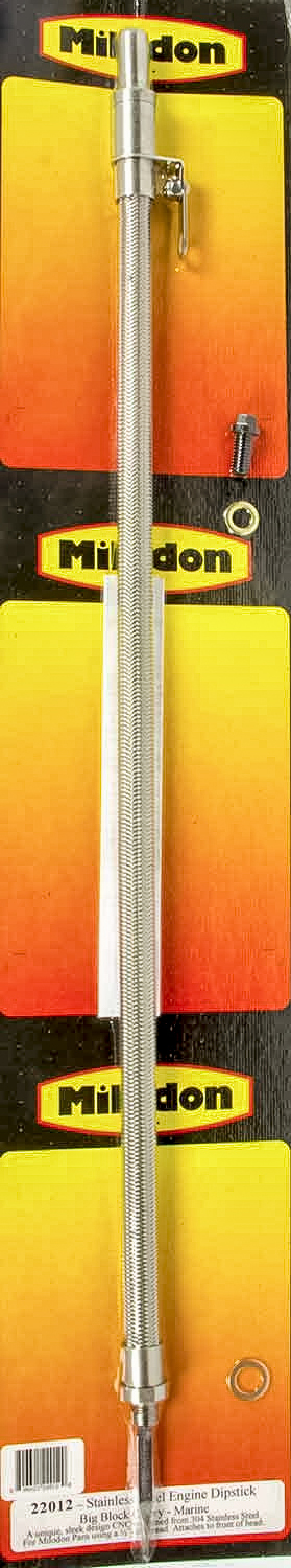 Product Description Engine Oil Dipstick - Pan Mount - Billet / Braided Stainless - Natural / Polished - Marine Milodon Pan - Big Block Chevy - Each