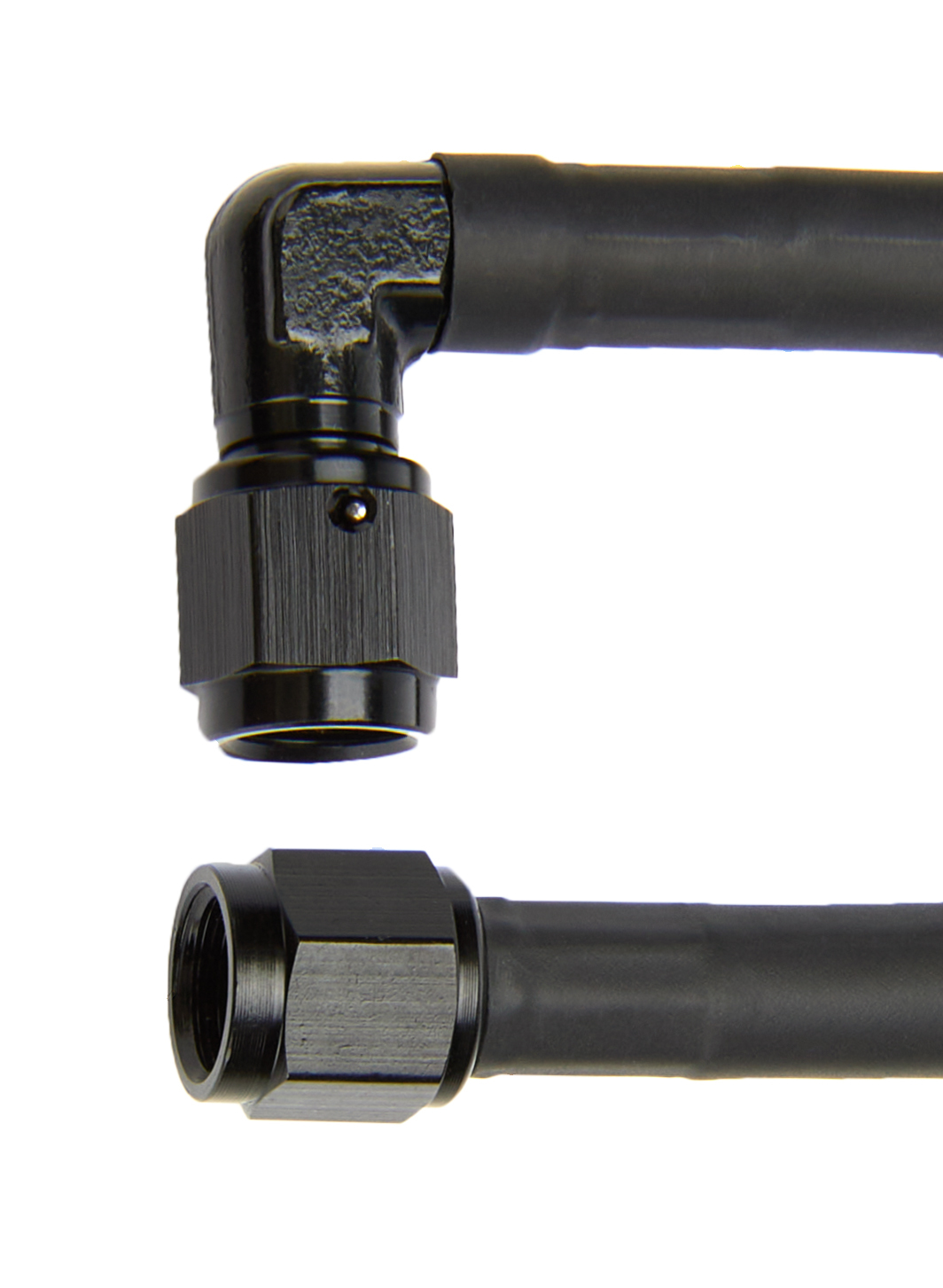 Product Description Brake Hose - 24 in Long - 4 AN Hose - 4 AN Straight Female to 4 AN 90 Degree Female - Braided Stainless - Black Vinyl Coated - PTFE Lined - Each