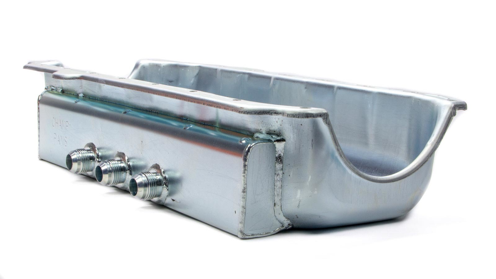 Product Description Engine Oil Pan - Dry Sump - 4.5 in Deep - Three 12 AN Male Passenger Side Pickups - Steel - Zinc Plated - 2-Piece Seal - Small Block Chevy - Each