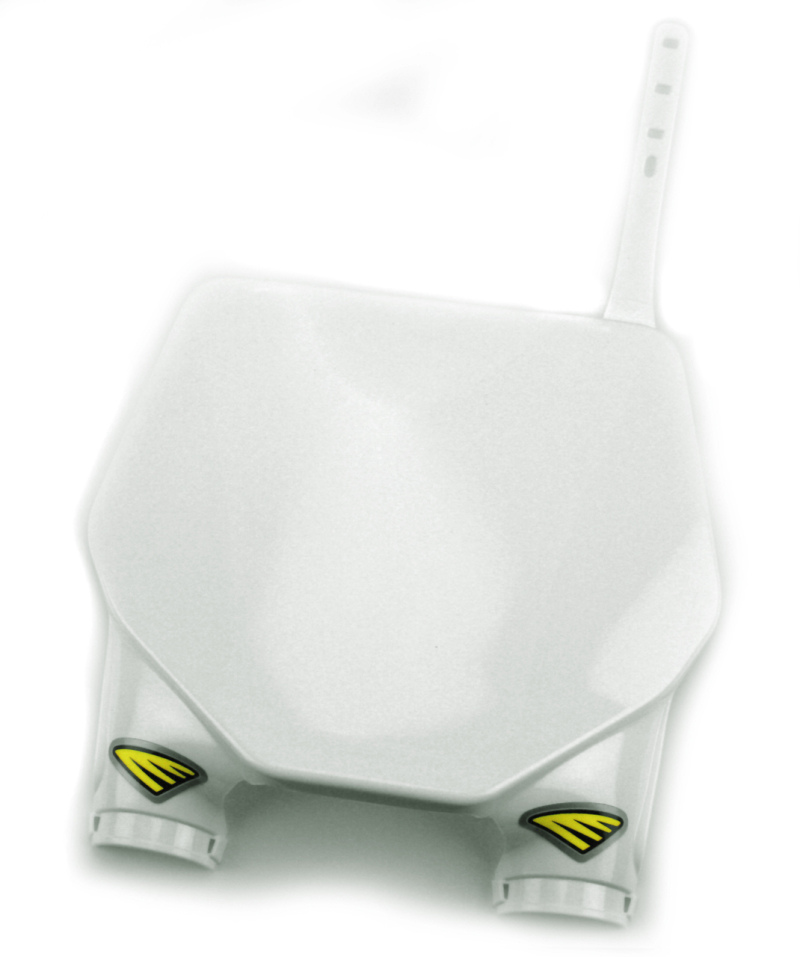 Cycra stadium number plates are better than stock. Redesigned for a better fit, these rugged and ultra-light Cycra Stadium plates are injection-molded with added clearance for stabilizers and cables. Their fork mounting tabs allow for an easy installation to aftermarket/stock triple clamps, plus roost protection for triple clamps.
