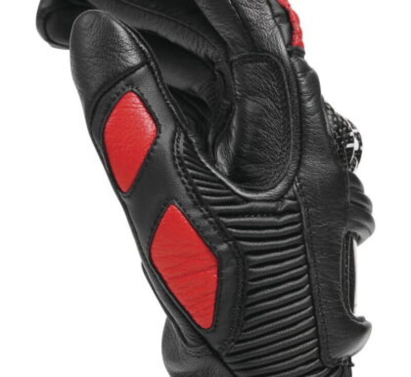 The Dainese Druid 4 leather racing gloves are an expression of the highest protection standards, designed for maximum performance on the track and the road. World Championship safety and ergonomics are guaranteed by the presence of the pre-curved and thermoformed sleeve, the carbon inserts on the knuckles and back, and the thermoplastic protector on the little finger. They are guaranteed to be resistant owing to the polyurethane inserts on the palm and joints, while four-way stretch ensures extreme comfort and a perfect fit at all times.
