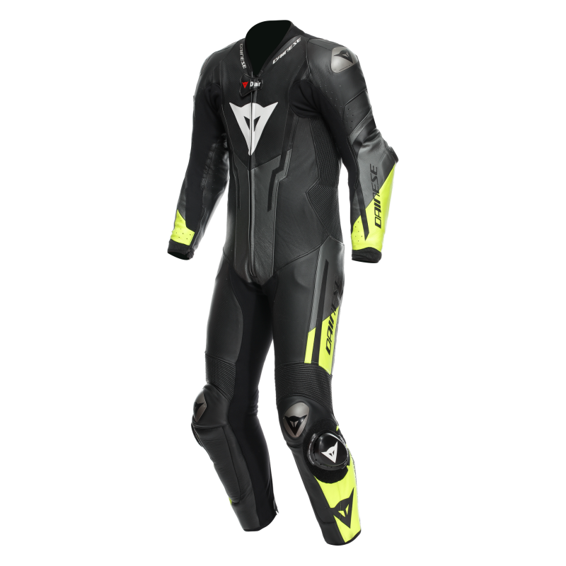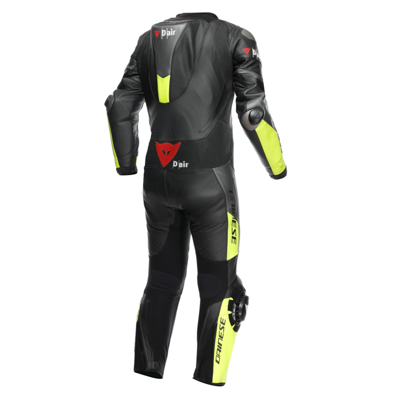 The state-of-the-art motorcycle suit. Constructed of high-quality D-Skin 2.0 full-grain cowhide, Misano 3 Perf. D-air® is designed to offer maximum levels of performance and safety on the track. Maximum performance is ensured by the technologies used to make the suit, with the result that it's extremely ergonomic and lightweight. A development of the triaxial concept, the innovative pentaxial elasticity system on the back allows greater freedom of movement and increased mobility on leans, given by the ability of this technology to extend in five directions and smoothly adapt to the rider's movements. The Misano 3 Perf. D-air® is equipped with the D-air® RACING SHIELD 3X system, featuring the convenient Racing Shield airbag with patented microfilament technology supporting up to 3 activations. The system covers the neck, collarbone, and shoulder areas and can be recharged by independently replacing the state-of-the-art gas generator. For the highest levels of ergonomics and comfort, the suit features the Veloce Racing Neck system which reduces pressure on the neck while increasing freedom of movement, Pro-Armor protectors on the shoulders and soft inserts on the hips. The cuffs have self-locking zippers to replace the conventional Velcro, and the Soft Edges Construction system on the nape and cuffs allows adaptable fit for all arm shapes and lengths and enormous comfort. All the ends are made of soft anti-abrasion fabric, comfortable and resistant. The aluminum plates on the knees, shoulders and elbows -an iconic Dainese feature - are designed to assist the slide in the event of an accident. The Replaceable Slider System (RSS) makes it possible to change the knee slider without changing the position of the base attached to the Velcro on the suit. The sliders at the elbows can easily be adjusted to two pre-defined positions, according to preference and the lean angle reached.