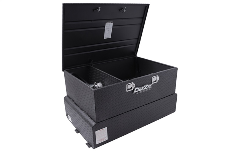 Dee Zee Combo Tanks - The convenience of a utility chest connected to a liquid transfer tank. Constructed of heavy duty .125 Brite-Tread aluminum. Radius curve design eliminates key weld pressure points. Aluminum is durable light weight and eliminates the worry of rust. Tanks feature stability baffles, 3/8 in. drainage plug. Tool box offers lockable storage with high quality stainless steel paddle handles and features gas shocks. Coated with NRT(TM) (No Rust Technology) black powder coat for optimal ruggedness and resistance against corrosion.Tanks are intended for private use (non-commercial). Not designed for use as an auxiliary fuel system. Not designed for use as an auxiliary fuel system. Does not meet title 49 of the United Stated Federal Registry governing transportation.