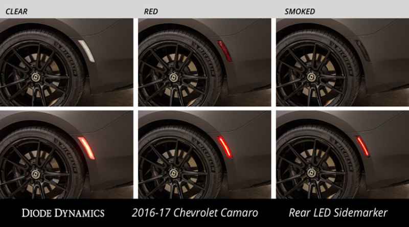 Features Modern LED replacements compatible with Chevrolet Camaro 2016-2023 factory sidemarkers Increased output, with LED styling Plug-and-play installation, no modification needed Includes four sidemarkers, to replace both front and rear OEM-grade retroreflector optics Engineered and assembled in USA Overview Upgraded Styling. If you're looking to give your vehicle an upgrade in styling and appearance, this is the perfect way to do it! These replacement units are loaded with hundreds of LEDs, for a modern and unique appearance. With the full LED array, they illuminate brighter than factory as well! Choose from three lens color options to match your vehicle or preference. OEM Grade. Unlike others on the market, the Diode Dynamics LED sidemarkers use OEM-grade retroreflector optics, which provide required the reflective safety and a clean, premium appearance when off. Compare this to "diffuser" or plain flat lenses, without any reflective features. The units themselves are designed directly from OEM CAD data for a perfect fit, and the connector plugs right into the factory socket. Reliability. Like most Diode Dynamics products, these Sidemarker LEDs compatible with Chevrolet Camaro, are designed with newer constant-current circuitry and transient voltage protection. These features, found in factory-installed lighting components, protect the circuit over time, ensuring years of flicker-free performance.