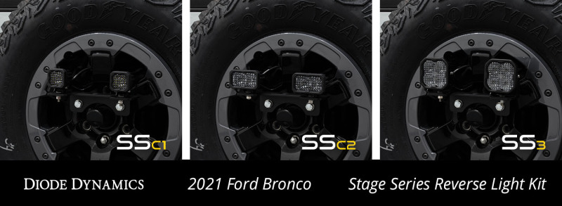 Features Direct fitment compatible with Ford Bronco 2021-2025. Allows you to mount SSC1, SSC2, or SS3 LED pods to the spare tire. Custom-designed harness for simple wiring, with OEM connectors and aux switch override. Provides high-power reverse light, and red accent light. Bolts on to spare tire carrier using included 60mm or 90mm extension lugs. Designed and assembled in USA. Overview. There's plenty of ways to add light behind your vehicle, but the new Stage Series Reverse Light Kit stands out with innovations in both function and ease of use. This kit includes an integrated red running light, and plug-and-play wiring harness, for trouble-free installation! Thanks to Stage Series TIR optic technology, this kit provides a huge amount of extra reverse light. The included switch allows you to toggle it on any time, or activate automatically with your reverse lights, for a truly integrated solution. Plug and Play. Thanks to custom-molded OEM connectors, this kit is completely plug-and-play. The included adapter harness plugs right into your factory tail lights for easy installation and operation. No cutting, drilling, or additional wiring needed! The kit operates as an additional red accent light, with your tail lights, and then automatically switches to a high-power backup light when your vehicle is in reverse. The included toggle switch allows you to override the vehicle signals and turn on the main beam anytime. Backlight Functionality. The Stage Series LED pods included with this kit feature a distinctive backlight in a vibrant red color which functions as an additional accent light while driving! The backlight fully illuminates the TIR optic, providing a more unique and modern look than the small indicator LEDs found in other products.