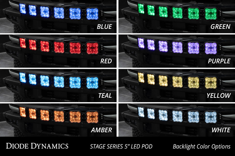Features Bolt-on fitment compatible with Ford Bronco 2021 Ultra-high intensity, with custom-engineered TIR optics Selectable backlight color, with eight color options Torture-tested, heavy-duty construction Control through factory aux switch bank using the included harness Assembled in USA Overview Perfect Fitment. The Grille CrossLink Lightbar Kit compatible with Ford Bronco 2021 from Diode Dynamics allows you to mount six linked SS5 LED pods on the factory grille. These application-specific brackets were CAD-designed to bolt into place using factory mounting points on the grille. No cutting or drilling required! Designed for Performance. Featuring the highest output intensity of any 5-inch LED pod on the market, these lamps have been designed for maximum functionality, with patented technology and custom-engineered TIR optics, all in a durable package. Selectable Backlight. The Stage Series 5inch LED Pods included in the White kit feature a selectable backlight with eight different color options, perfect for an extra styling accent, or for more visibility when you’re not using the main beam. Selecting your backlight color is easy - simply alternate the power on and off. There’s no complicated programming with a controller! The SS5's backlight fully illuminates the TIR optic, providing unique accent lighting that you won't find on other LED pods. NOTE: Due to the yellow lens, the Yellow kit is only available with an Amber backlight color. CrossLink. Our patent-pending CrossLink technology allows you to link up to eight SS5 pods together to create your own lightbar. The single-piece CNC aluminum link provides extreme rigidity, but is fully adjustable, for both straight and curved configurations.