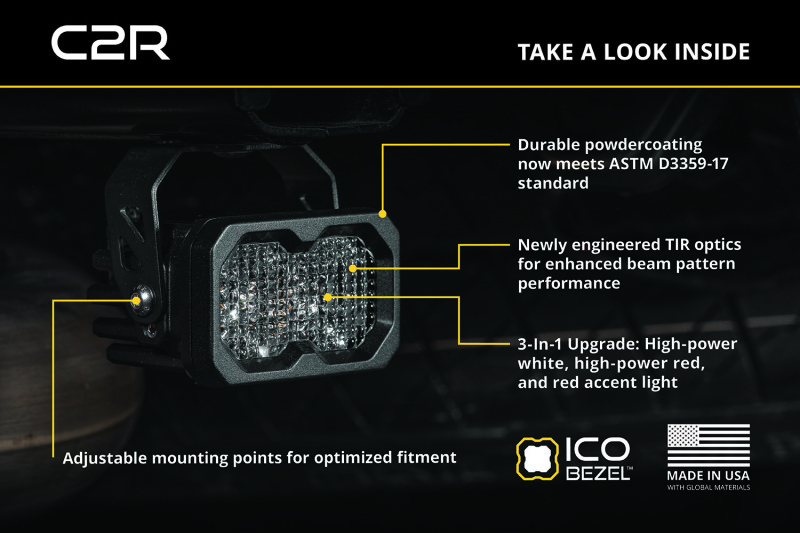 OverviewIntroducing the Stage Series C2R LED Pod! Building on the versatility of the original C1R the C2R features upgraded performance in a compact dual-LED package. It delivers triple-function output with a high-power white main beam a high-power red output and a low-power red accent light ideal for reverse lighting 4th brake light applications or rear accent lighting.Triple Function. The Stage Series C2R LED pod features a cool white main beam along with a high-power red main beam and low-power red accent light that can be activated independently. The C2R was designed to serve as a high-power reverse light along with your factory reverse lights a 4th brake light when your brakes are applied and a secondary running light with your taillights.Functional Output. All Stage Series beam pattern options were designed with optical simulation modeling to shape the output in a highly-functional beam pattern. No matter what your auxiliary lighting needs are there is a Stage Series optic for you!Simple connections. All C2R LED pods feature a custom-molded DT-type Deutsch-style connector on the back and come with a 4-pin 6-inch pigtail with bare leads. The yellow wire on the pigtail powers high-power red the red wire powers the white main beam the blue wire powers low-power red and the black wire is ground.Proven Reliability. Stage Series LED lighting has been extensively tested for long-term operation from -40 to 185 degrees F along with vibration moisture intrusion and corrosion testing. All of these tests are completed to SAE standards just like factory components. They've also been put to the test on-road by racers and enthusiasts alike.