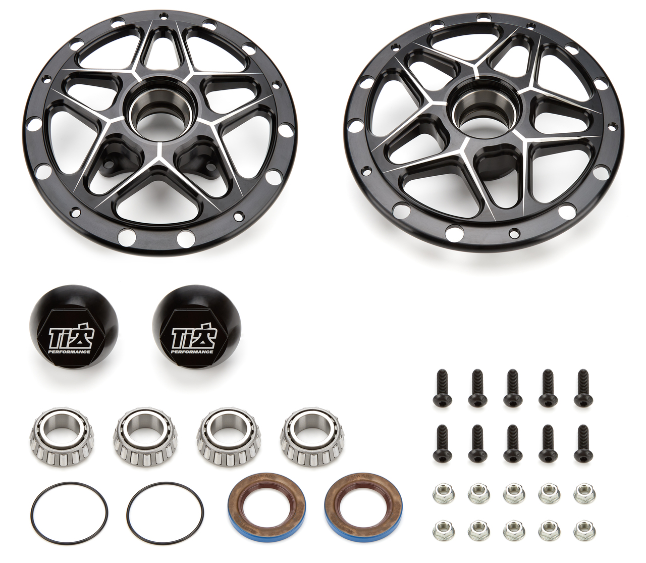 Product Description Wheel Hub - Front - 2 Direct Mount Hubs - Bearings / Dust Cap / Nuts / Races / Seals / Wheel Studs Included - Aluminum - Black Anodized - Pair