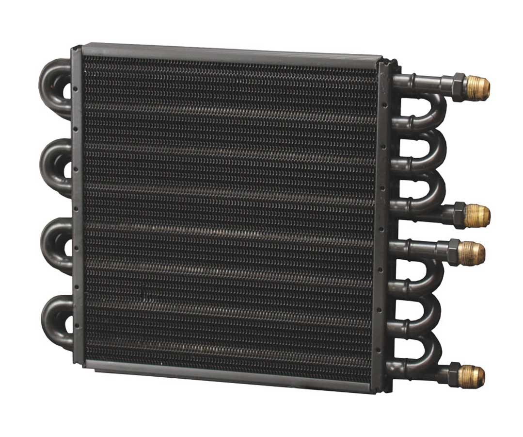 Product Description Fluid Cooler - 8/8 Pass - 13.938 x 10.5 x 1.75 in - Tube Type - 8 AN Male Inlet / Outlet - Aluminum / Copper - Black Powder Coat - Universal - Each