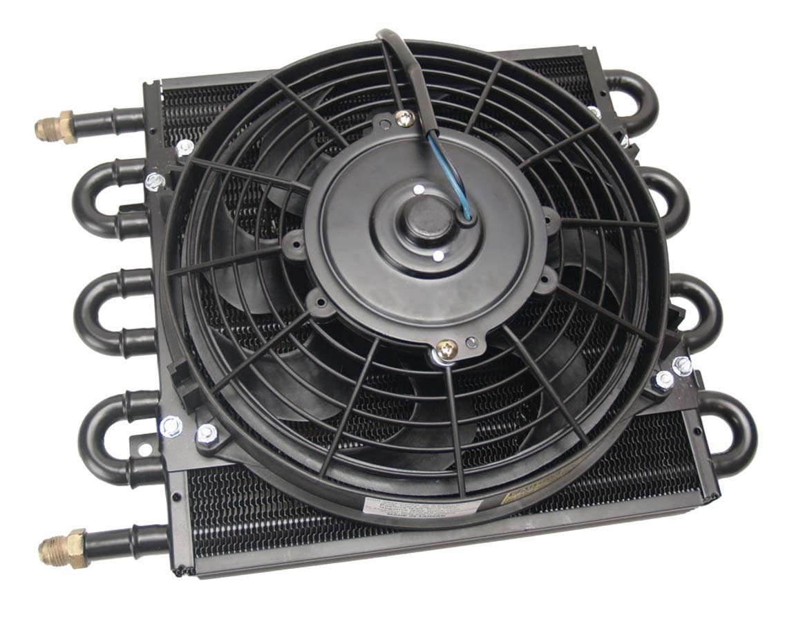Product Description Fluid Cooler and Fan - 17.75 x 10.25 x 3.75 in - Tube Type - 6 AN Male Inlet / Outlet - Aluminum / Copper - Black Powder Coat - Universal - Each