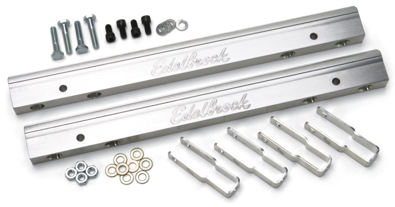 All Edelbrock fuel rails are machined from high quality extruded aluminum. Each kit includes fuel rails, stands and mounting hardware. Fuel fittings, crossover line and regulator not included. 3633 Big-Block Chevy Fuel Rail kits is for use with Super Victor Manifolds #29275 and #29025 and standard injectors. Rails will have a Clear Anodized Finish and -6 AN inlet/outlets.