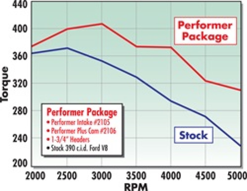 Edelbrock Performer-Plus Camshaft #2106 is designed for 352-428 Ford V8 engines and produce optimum torque from the low-end to the mid-range. Performer-Plus camshafts should be matched with Performer manifolds for vehicles operating from off-idle to 5500 rpm. The Performer-Plus #2106 is a smooth idling cam for daily drivers, trucks, vans, RVs and 4x4s. You can expect a major improvement in throttle response and torque. In the manifold section you'll find torque graphs showing the power gains from Performer manifolds and Performer-Plus cams. All camshafts include flat tappet lifters (except for cams designed for use with stock roller lifters), assembly lube and instructions. This cam produced 410 Ft Lbs of Torque when paired with Performer 390 intake manifold #2105 and stock cylinder heads. Will not work in 427 side-oilers. Camshaft specifications: - Intake duration: 194 Degrees - Exhaust duration: 204 Degrees - Intake lift: .460" - Exhaust lift: .480" - Lobe separation: 110 Degree - Intake Center Line: 105 Degree - Vacuum: 16"