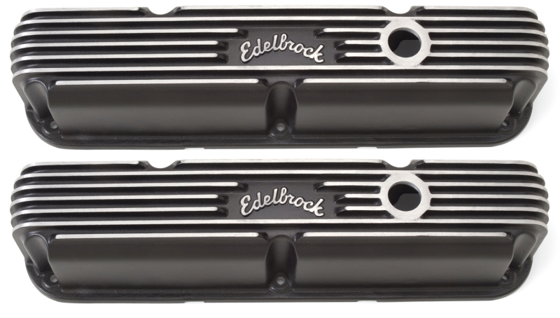 Edelbrock part #41763 Classic Series Valve Covers are designed for Chrysler Small-Block LA 318-340-360 applications and have a Black finish. Edelbrock first made these aluminum valve covers in the late '50s and they're still a classic. Made of heavy-gauge sand-cast aluminum, Overall height is measured from base to top at the highest point. Edelbrock classic valve covers can be machined to accept breathers if desired.