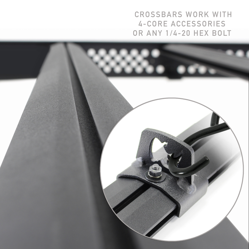 The CEROS Low Profile Aluminum Roof Rack brings cutting edge style and practicality to your truck. The aerodynamic, low profile design contours the vehicle roof’s curves with application-specific fit. The CEROS utilizes Go Rhino’s exclusive 4-CORE crossbars, an extruded track system that can work with any 1/4-20 hex bolt and offers unlimited mounting options for accessories, gear and tools. The frontmost crossbar supports the front fairing and can be used to mount light bars or multiple cube lights. The dropped edge of the fairing allows a single row light bar to remain flush with the frame’s topline, maintaining the sleek, streamlined look. (Note: Lights sold separately.) CEROS Racks come with a Limited Lifetime warranty on materials and construction and a 5 year warranty on the Textured Black Finish.