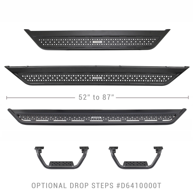 Dominator D6 Side Steps allow for easy access in and out of the vehicle and provides slider protection along the rocker panel of vehicle. The step area is 6in wide and has a raised hex pattern for no slip grip. The D6 Drop Steps come with a Limited Lifetime warranty on materials and construction and a 5 year warranty on the Textured Black Finish.