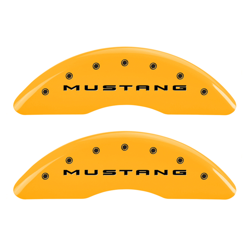 MGP Caliper Covers are a car accessory designed and manufactured specifically for your 2021-2023 Ford Mustang to cover up and hide those ugly brake calipers. These aluminum caliper covers are finished with a high-quality powder coat. MGP caliper covers will enhance your wheel appearance and curbside appeal with either black, yellow or red caliper covers. MGP Brake Caliper Covers are tested for safety fitment and are licensed by major manufacturers.