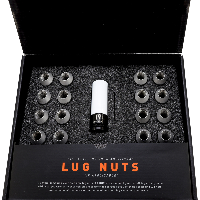 Lock down your wheels with confidence. The Mishimoto Steel Locking Lug Nut 20-piece Kit features a one-piece design that eliminates the common failure points of two-piece lug nuts. Each lug nut is built from high-strength steel to resist swelling, cracking, and impact stress over time.This kit includes 16 standard lug nuts and 4 locking nuts, secured with a 7-point, non-marring locking tool to protect your wheels without damaging the finish. The 19mm hex size fits a wide range of aftermarket wheels, and the open-ended design accommodates extended studs. Available in black or silver, this kit is backed by the Mishimoto Lifetime Warranty to keep your wheels stylish and secure for the long run.