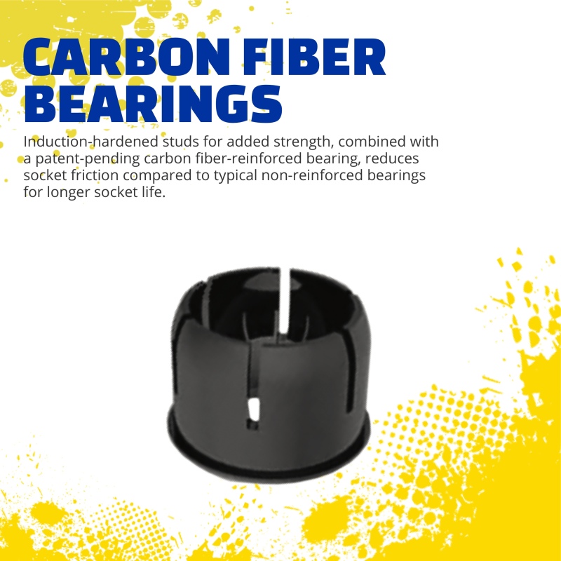 CARBON FIBER BEARINGS -- Induction-hardened studs for added strength, combined with a patent-pending carbon fiber-reinforced bearing, reduces socket friction compared to typical non-reinforced bearings for longer socket life.