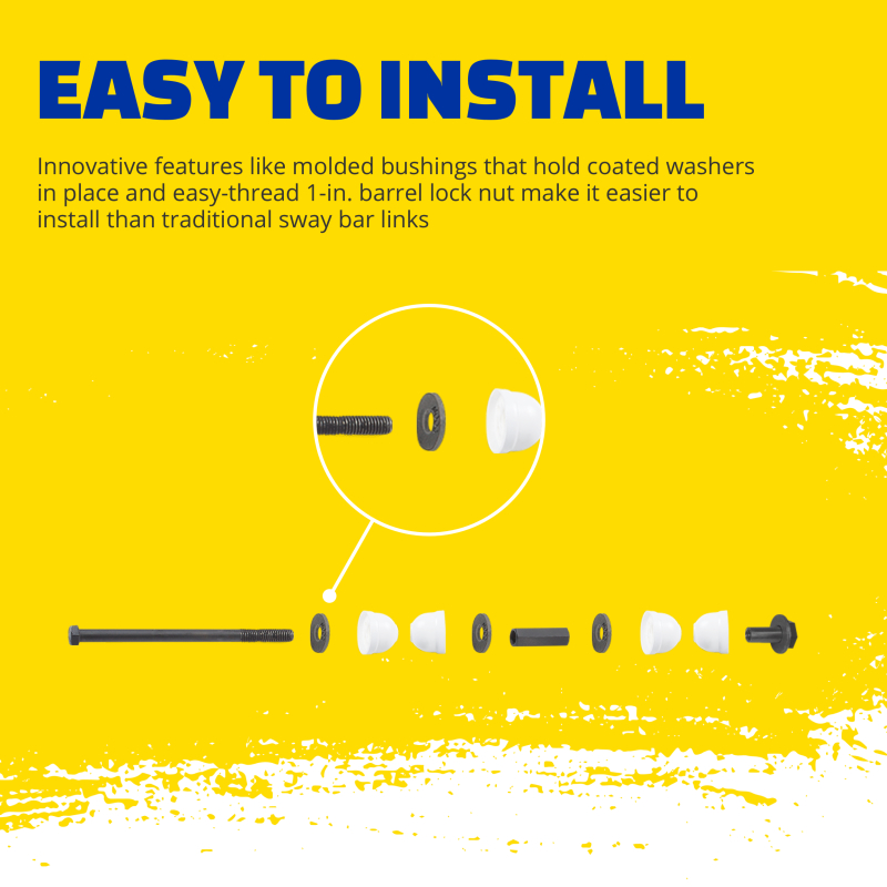 EASY TO INSTALL -- Innovative features like molded bushings that hold coated washers in place and easy-thread 1-in. barrel lock nut make it easier to install than traditional sway bar links