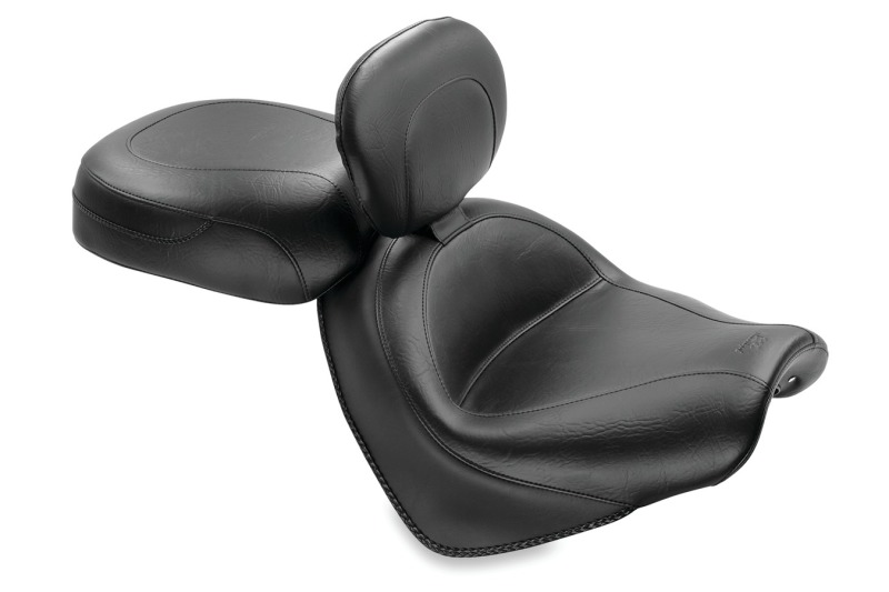 Available with or without a built-in fully adjustable and easily removable driver backrest, Mustang's Wide Touring solos feature a deeply pocketed 17" wide driver seat that provides ample support. Places the rider at a similar position to stock with extra width in the hip area for all-day comfort. The matching 12.5" wide passenger seat offers comfortable 2-up riding and extends forward for added driver back support on seats without the built-in driver backrest. Recessed Passenger seats are designed for use with the built-in driver backrest to allow full adjustability.