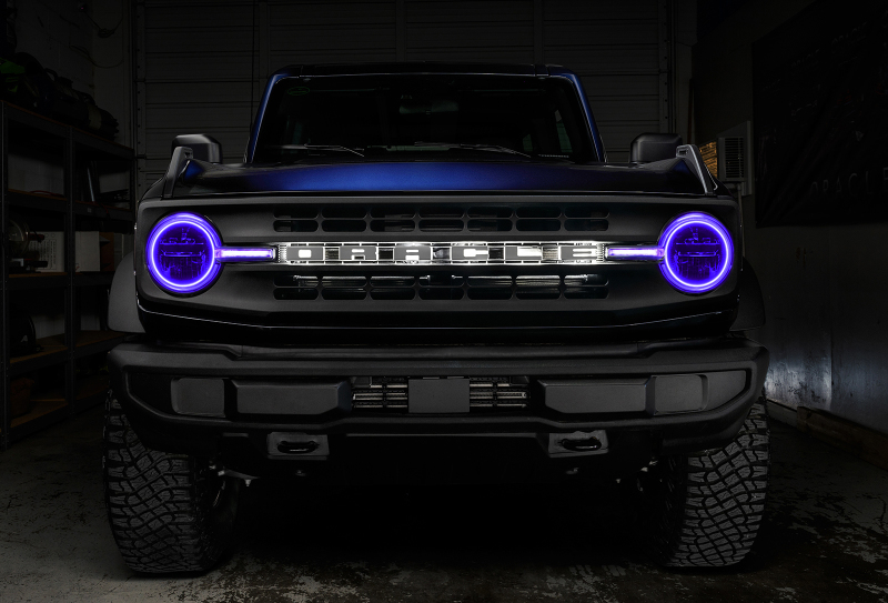 Looking to modify your vehicle's headlights for a customized, eye-catching style? The ORACLE Lighting Halo kit with DRL Bar for the 2021-2022 Ford Bronco Base offers a perfect solution with an expertly-crafted design, brilliant colors with the best quality LED components, and unique features that will satisfy any truck enthusiast. While some vendors cut corners, we use advanced LED chips that produce an impressively bright output while consuming less power. Our SMD halos feature these chips installed onto a sturdy CAD-designed circuit board that easily mounts to a light housing using the pre-installed 3M adhesive tape backing. The additional DRL bar provides vibrant color into the turn signal portion of the light for impactful style across the front end. Easily control the halos and DRL bar with one of our easy-to-use controllers, which gives the user RGB control thanks to the 5050 tri-node LEDs that allow you to select any color imaginable. Using the latest lighting technology, our cutting-edge halo kits for trucks are a great way to personalize your ride with show-stopping looks and industry-leading performance. Stand out from the look-alikes with an ORACLE Lighting halo kit!