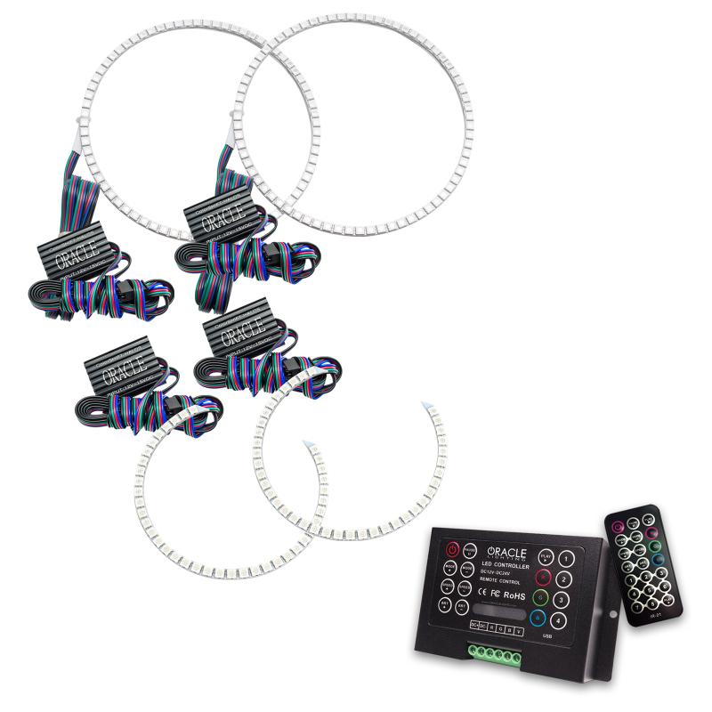 The ColorSHIFT(tm) Halo Kit can produce any color including whites from 3000K-15000K with the push of a button. This allows the user to dial-in the exact color rings that they desire. These 3-Chip 5050 SMD rings are BRIGHT, and for some they may be too bright, that is why (for the first time) the user has full control over the ring brightness. ORACLE SMD or "Surface Mount Diode" Halos utilize an advanced type of LED chip that can produce brilliant light output while only consuming a small amount of power. The SMD chips are installed onto a CAD designed 6-layer PCB (Printed Circuit Board) which is very sturdy and will not break if pressured. The PCB can easily be mounted to a headlight housing using the pre-installed 3M adhesive tape backing.