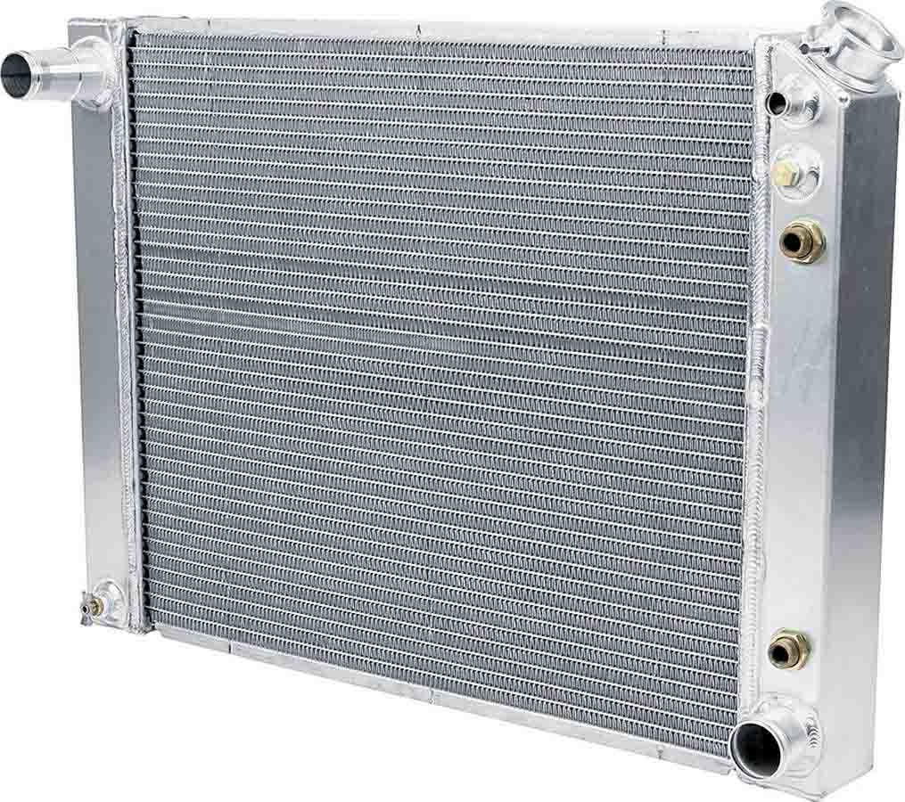 Product Description Radiator - 26 in W x 19.5 in H x 2.25 in D - Driver Side Inlet - Passenger Side Outlet - Oil Cooler - Aluminum - Natural - GM F-Body 1970-81 - Each