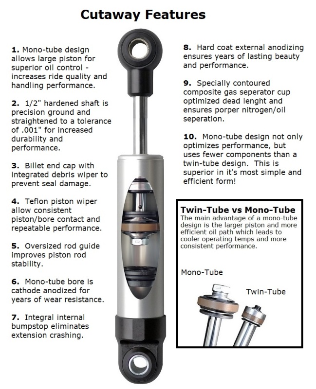 Rear HQ Shock Absorber with 7.55" stroke with wide t-bar/eye mounting. Includes 1 rebound adjustable shock with 9/16" I.D. bushing sleeves. 13.15" x 20.7" with a 16.5"-17.5" ride height.