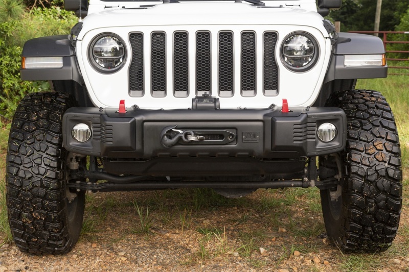 The Spartacus(TM) Stubby Front Bumper from Rugged Ridge(R) features the same unmistakable styling as the original Spartacus, but with a narrow, trail-conquering profile. Our tough satin black powder-coated finish on a sturdy 11 gauge stamped steel construction makes this a bumper built to last. The stamping process allows for the most advanced styling on the market, creating a bumper lighter than most aftermarket steel bumpers and is designed to work with all popular Winch models (using Winch plate 11541.13 sold separately). Uses factory tow hooks. US Patent No. D760,133, D775,013, D800,036 & D776,582.