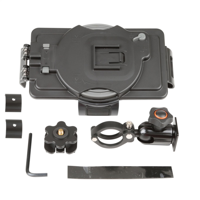When the pavement ends and the terrain gets harsh, never underestimate the importance of being in control. This universal phone mount is designed to provide a stable and adjustable method of securing your tablet for safer in-cab operation, allowing you to keep your eyes on the road and your hands up on the wheel. Designed to work in unison with the Rugged Ridge Gear-Vise Dash Bar (13551.36 in 18-20 Wrangler JL / Gladiator JT models), this universal tablet mount can also be used in a variety of other installation scenarios.