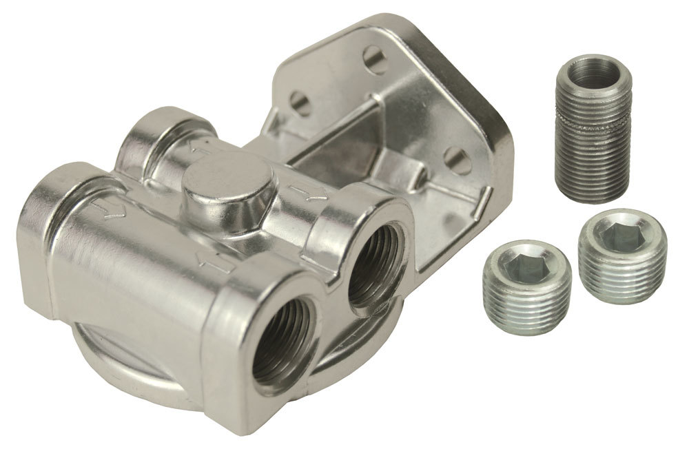 Product Description Oil Filter Mount - Side Port Style - 1/2 in NPT Female Dual Ports - 13/16-16 in Center Thread - Aluminum - Polished - Universal - Each