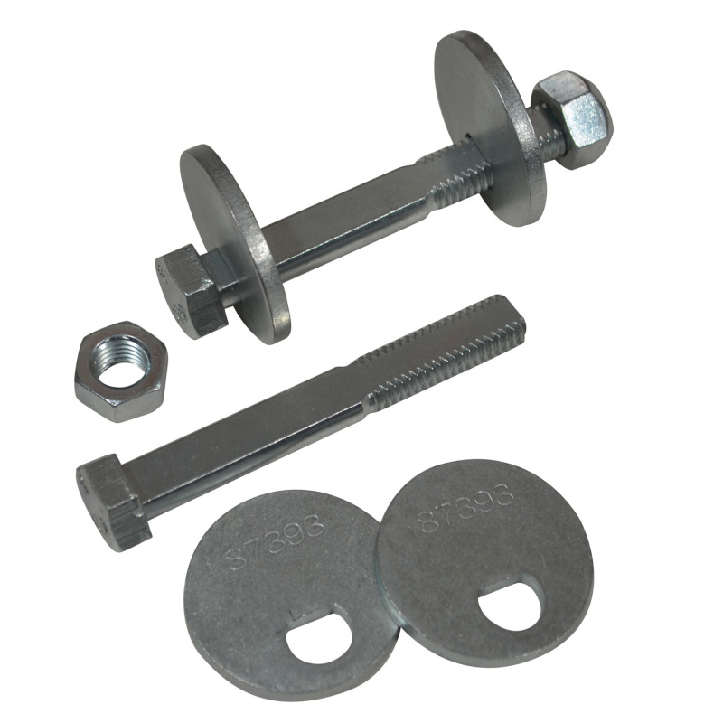These heavy duty cam bolts replace the upper control arm mounting bolts. This kit has the added convenience of slip-on cams which makes installation easier. Remove the O.E. bolts and replace them with these cams, rotating to provide camber and caster adjustment. Use 74910 punch to remove the O.E. slugs and elongate the holes. If necessary, 87400 includes 4 cam and bolt assemblies to cover both sides of the vehicle. California Residents WARNING