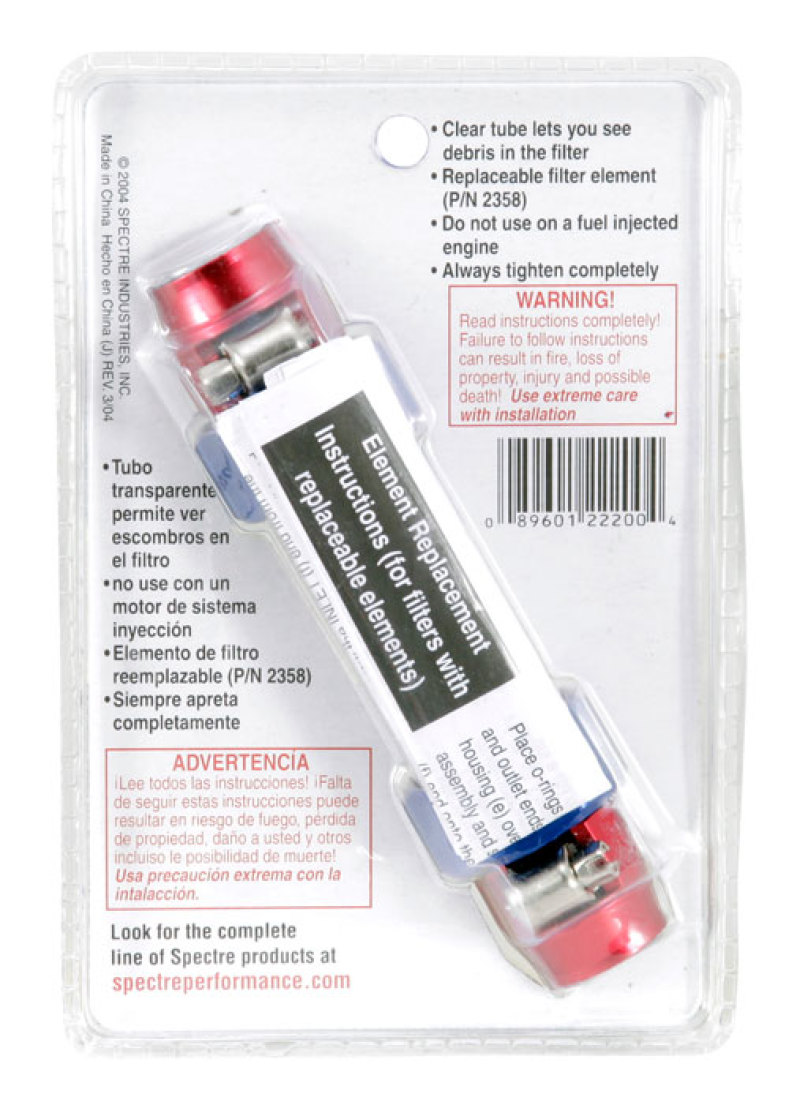 Product Description Spectre's Pro Plumbing Fuel Filter includes fully integrated magna-clamp hose fittings for any 3/8 inch fuel line. Features a red and blue design with a white mesh replaceable filter element, which gives good visibility to dirt in the filter.