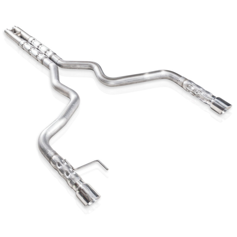 2015-16 Mustang GT 5.0L 304 stainless steel 3" catback dual-exhaust with H-pipe, retro chambered mufflers with 2.5" cores and mirror-polished stainless steel slash-cut conical double-wall tips. Includes hangers and clamps and is designed to mate to the factory connection point.