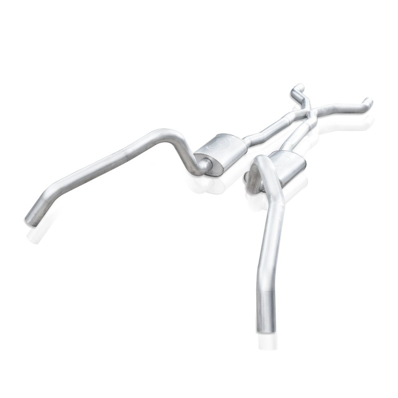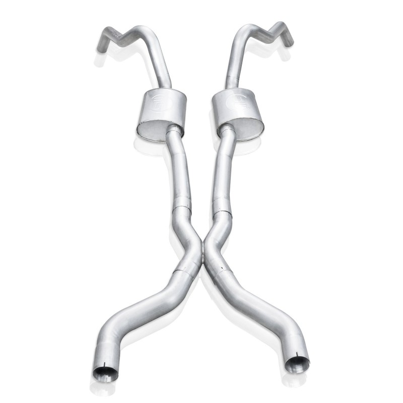 1962-67 Chevy II Nova SBC All tubes are CNC mandrel bent for optimal flow. Made from 304 stainless steel for maximum corrosion resistance. This huge 3" diameter 304 Stainless Steel Exhaust System. Designed to fit Hooker Headers (P/N 2243) or Stainless Works Private Label Church Boys Headers with 3" slip fit collectors (P/N NVSBCH188, NVSBCH175). The front leads flow into the X-pipe then flows into a set of dual chambered turbo mufflers out to a dual set of over-axle tailpipes that exits behind rear tire between quarter panel and leaf spring. All clamps and hangers needed to install this system on your car are included. Mill finish, All TIG welded for strength and durability. These kits come with a lifetime warranty and proudly made in the USA.