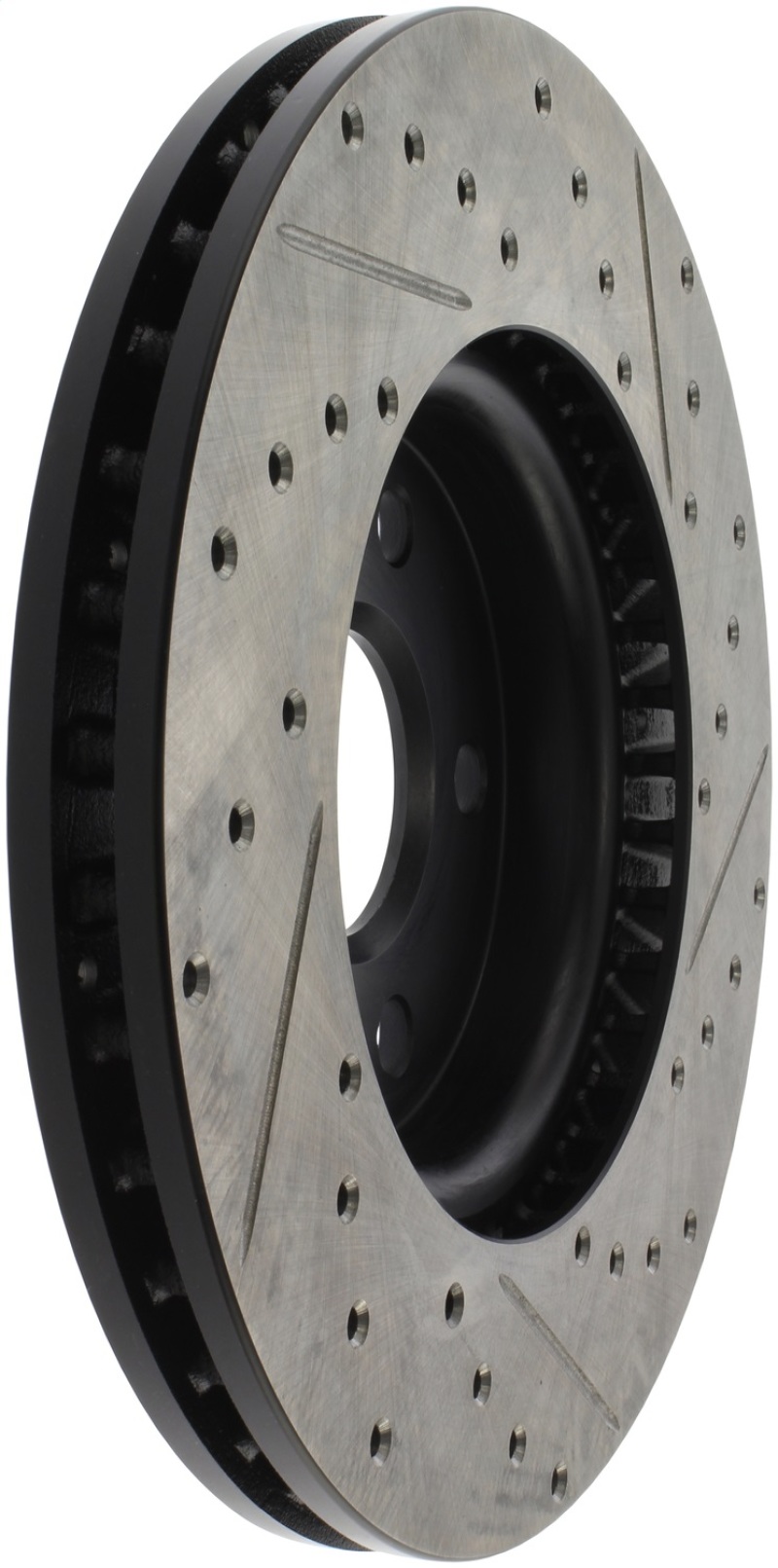 StopTech Drilled and Slotted Sport Rotors are 1-piece direct replacement brake discs for factory brake systems and stock calipers that look great behind your wheels – and offer significantly improved braking performance. The unique cross-drilling and slotting aids with heat and brake dust dispersal; prevents glazing of the pads; adds bite and improves wet and dry braking performance. Built to last; the black e-coating provides protection from corrosion and the high carbon metallurgy (in most applications) offers quieter operation; better crack resistance and increased performance.