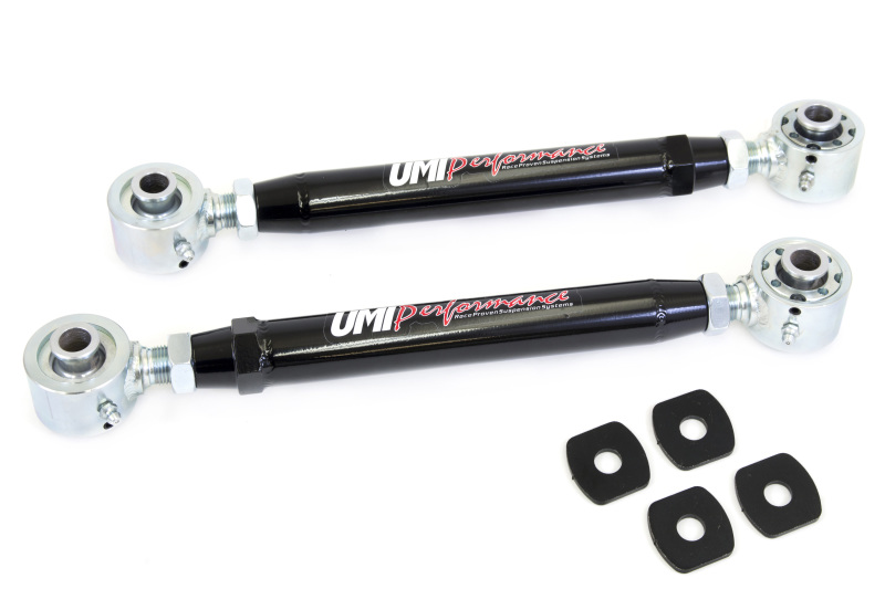 UMI Performance 2524 adjustable toe rods for the 5th Generation Chevrolet Camaro and G8 replace the weak stamped steel arms and soft rubber bushings with flex-free CrMo tubular arms and our exclusive Roto-Joints. UMI’s Roto-Joint allows smooth noise free suspension articulation and enhanced performance. Roto-Joints work excellent for street, auto-x, road race and light drag applications. On-car adjustability allows the factory eccentric washers to be eliminated. Included with the arms are new laser-cut anti eccentric washers to prevent unwanted toe changes (factory eccentric washers are prone to slipping). Available in red or black powder coat. 100% manufactured, tested and raced out of Philipsburg, PA – USA.